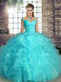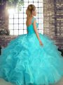 Floor Length Lace Up Quince Ball Gowns Aqua Blue for Military Ball and Sweet 16 and Quinceanera with Beading and Ruffles