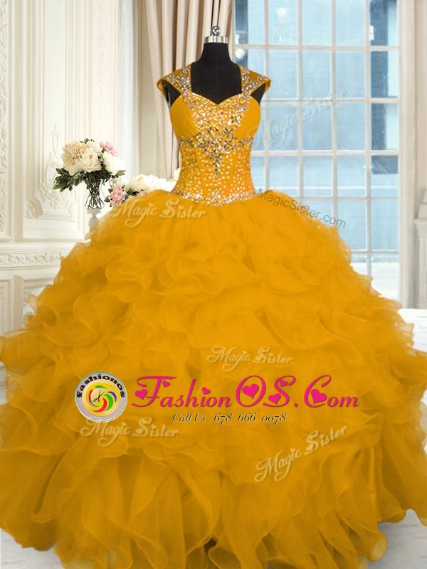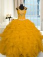 Floor Length Lace Up Quince Ball Gowns Gold and In for Military Ball and Sweet 16 and Quinceanera with Beading and Ruffles
