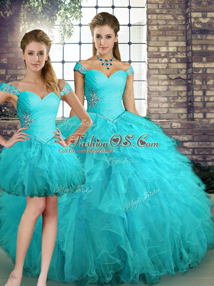 Home >  Quinceanera Dresses >  Detachable Quinceanera Skirts > Floor Length Lace Up Quinceanera Dresses Aqua Blue for Military Ball and Sweet 16 and Quinceanera with Beading and Ruffles