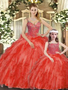 Floor Length Lace Up Quinceanera Gowns Red for Military Ball and Sweet 16 and Quinceanera with Beading and Ruffles
