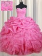 Floor Length Lace Up Sweet 16 Dress Rose Pink and In for Military Ball and Sweet 16 and Quinceanera with Beading and Ruffles and Pick Ups