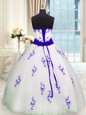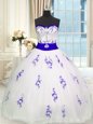 Floor Length Lace Up Sweet 16 Dress White and In for Military Ball and Sweet 16 and Quinceanera with Embroidery and Belt