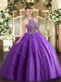 Floor Length Lace Up Sweet 16 Dresses Purple for Military Ball and Sweet 16 and Quinceanera with Beading and Appliques