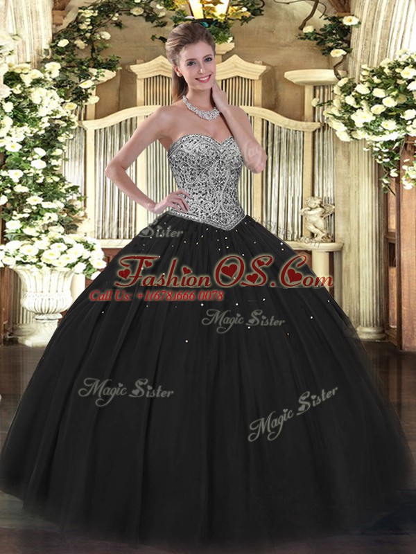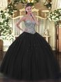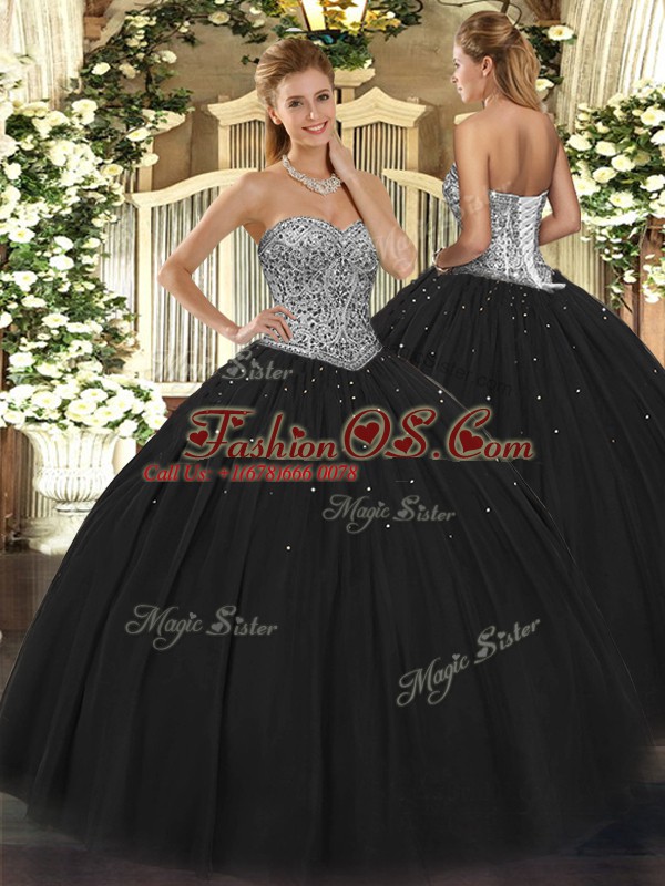 Floor Length Lace Up Sweet 16 Quinceanera Dress Black for Military Ball and Sweet 16 and Quinceanera with Beading