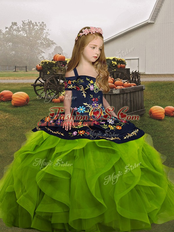 Floor Length Olive Green Child Pageant Dress Organza Sleeveless Embroidery and Ruffles