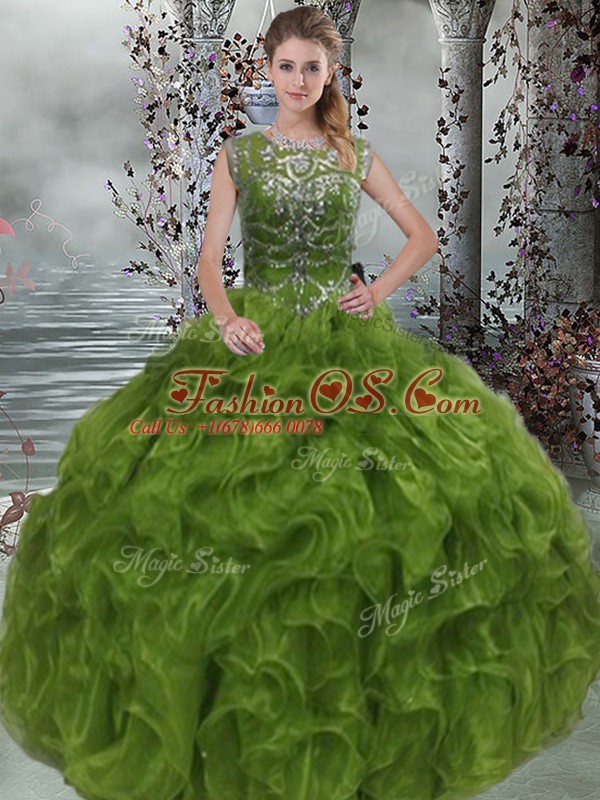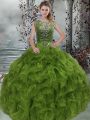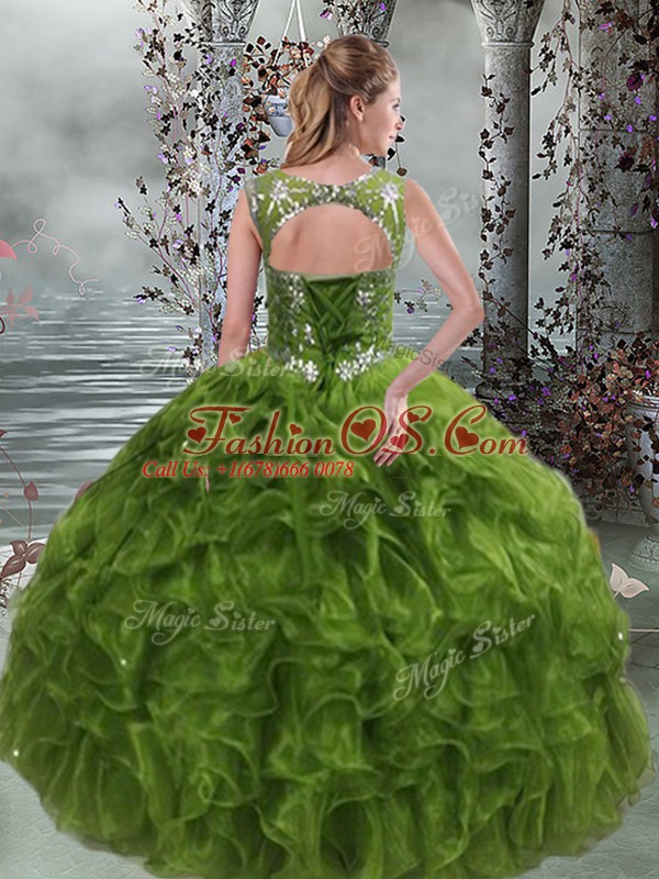 Floor Length Olive Green Sweet 16 Dresses Organza Sleeveless Beading and Ruffles
