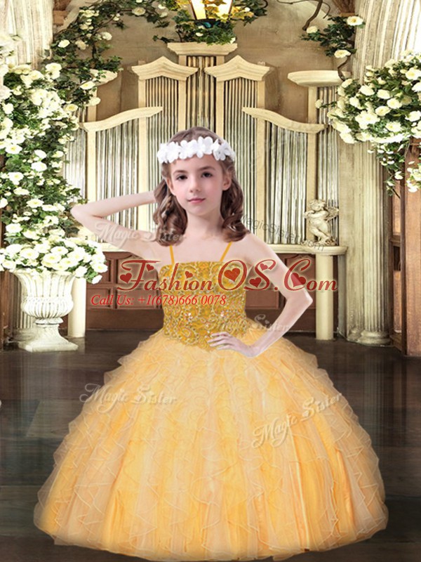 Home >  Special Occasion Dresses >  Pretty Little Girl Pageant Dresses > Floor Length Orange Little Girls Pageant Dress Wholesale Organza Sleeveless Beading and Ruffles