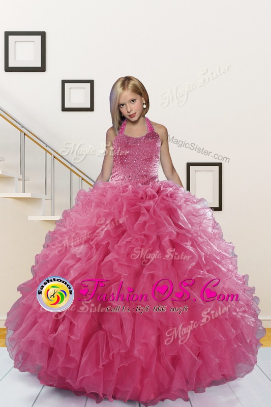 Home >  Special Occasion Dresses >  New Style Little Girl Pageant Dresses > Floor Length Pink Little Girl Pageant Dress Halter Top Sleeveless Lace Up