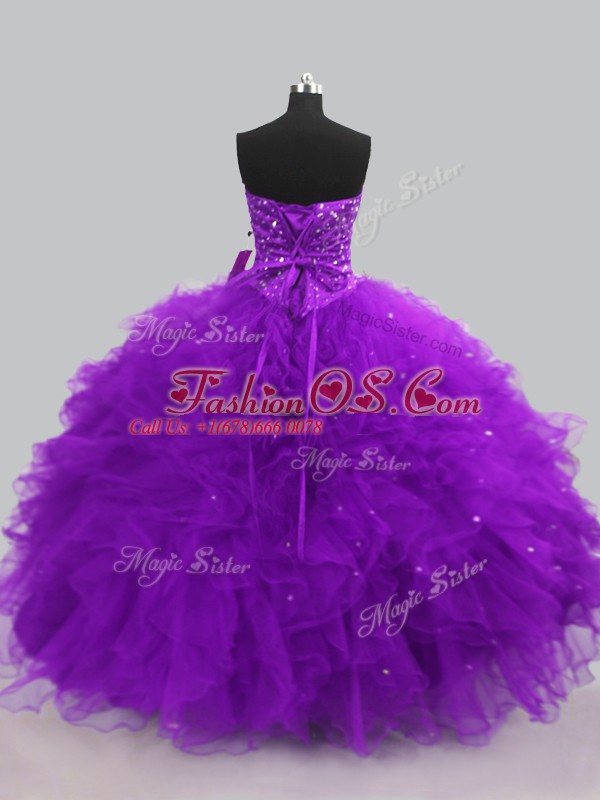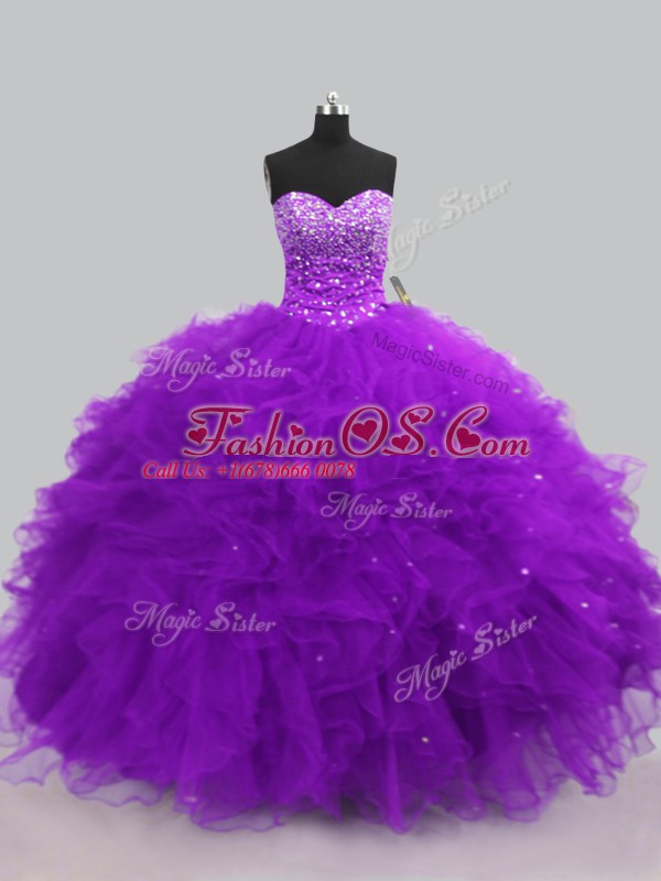 Floor Length Purple 15th Birthday Dress Tulle Sleeveless Beading and Ruffles