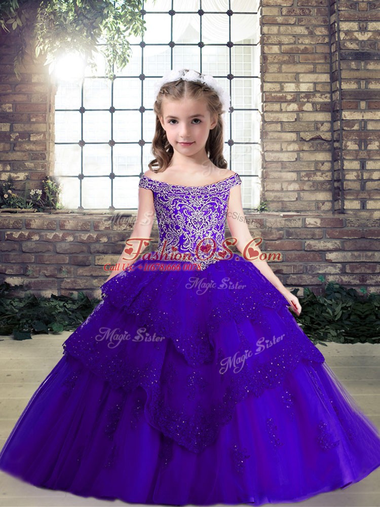 Home >  Special Occasion Dresses >  Lovely Little Girl Pageant Dresses > Floor Length Purple Child Pageant Dress Tulle Sleeveless Beading and Lace and Appliques