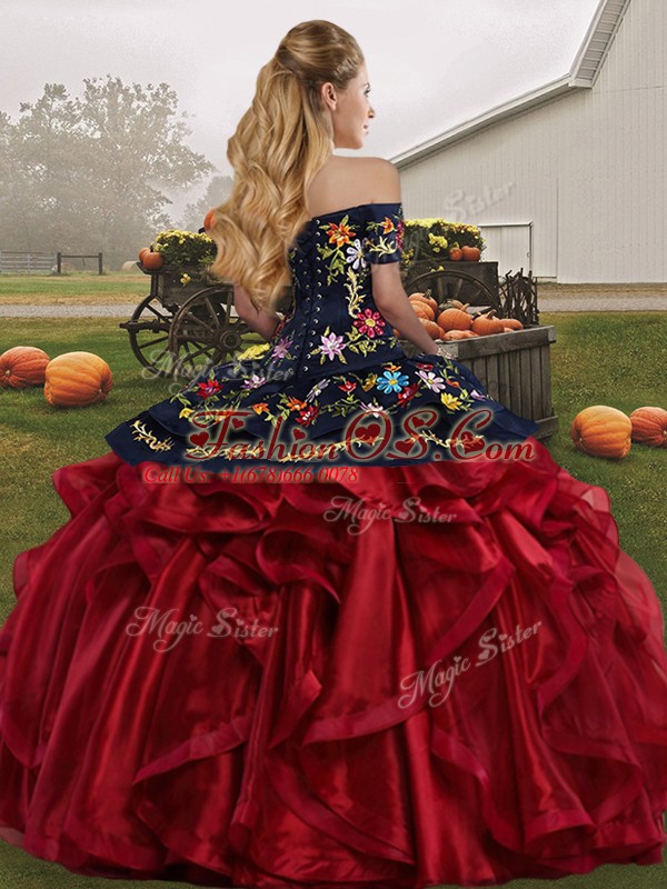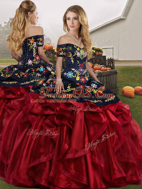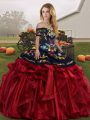 Floor Length Red And Black Sweet 16 Quinceanera Dress Organza Sleeveless Embroidery and Ruffles