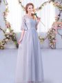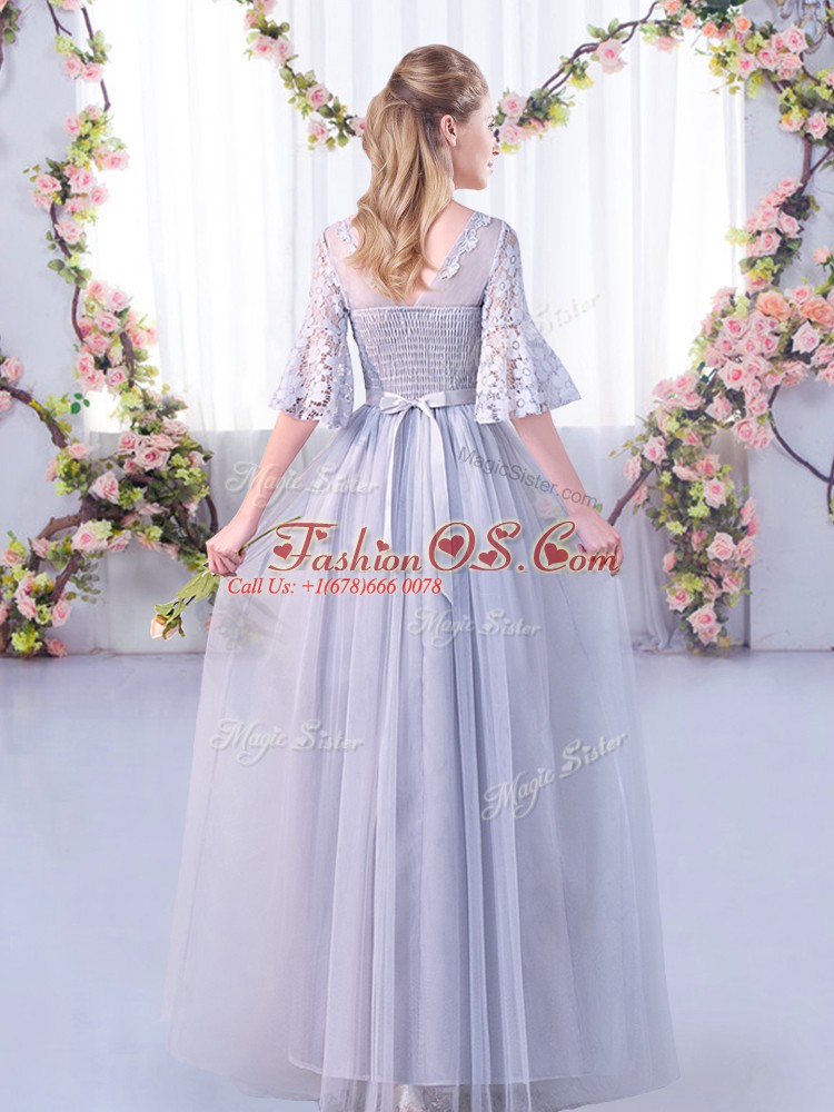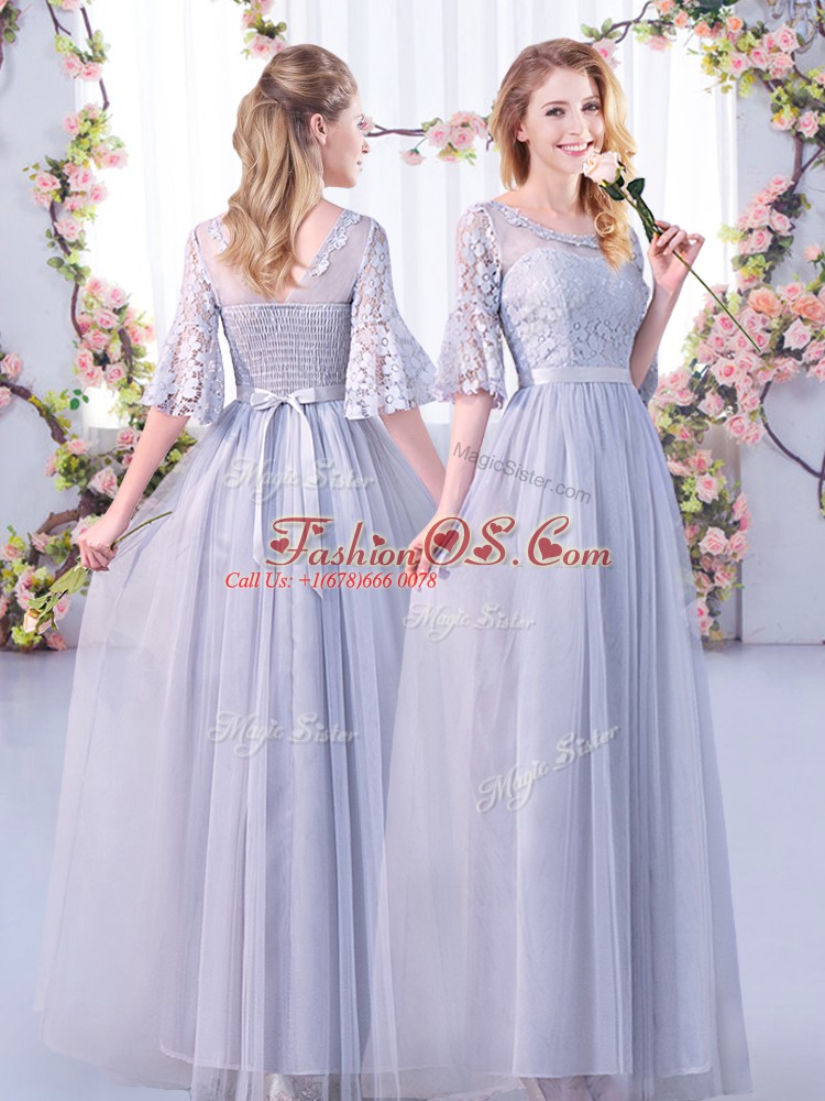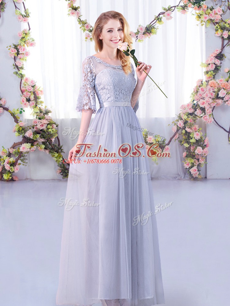 Floor Length Side Zipper Quinceanera Court Dresses Grey for Wedding Party with Lace and Belt