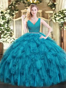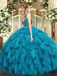 Floor Length Teal 15 Quinceanera Dress Tulle Sleeveless Beading and Ruffles