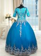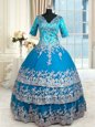 Home >  Quinceanera Dresses >  Unique Quinceanera Dresses > Floor Length Teal Sweet 16 Dresses Tulle Half Sleeves Beading and Lace and Appliques and Ruffled Layers