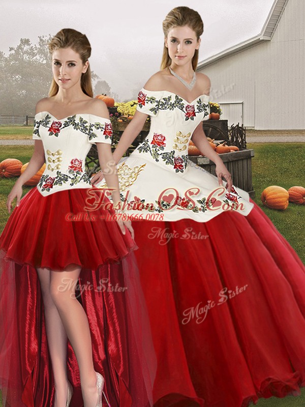 Floor Length Three Pieces Sleeveless White And Red Quinceanera Dresses Lace Up