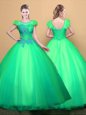 Home >  Quinceanera Dresses >  Beautiful Quinceanera Dresses > Floor Length Turquoise Vestidos de Quinceanera Scoop Short Sleeves Lace Up