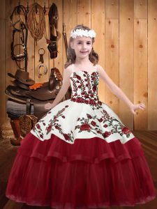 Floor Length Wine Red Kids Formal Wear Organza Sleeveless Embroidery
