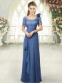 Floor Length Zipper Evening Dress Blue for Prom and Party with Beading and Ruching