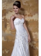 This distinctive gown has a sweetheart style bodice with a row of shimmering appliques beneath the bustline. The focus on this gown is the magnificent looking on the silhouette, with the gorgeous and shining appliques sprawling on the whole skirt beauteously.By the way, the dress is of sassy and sexy tulle with a sheath silhouette and a chapel train.