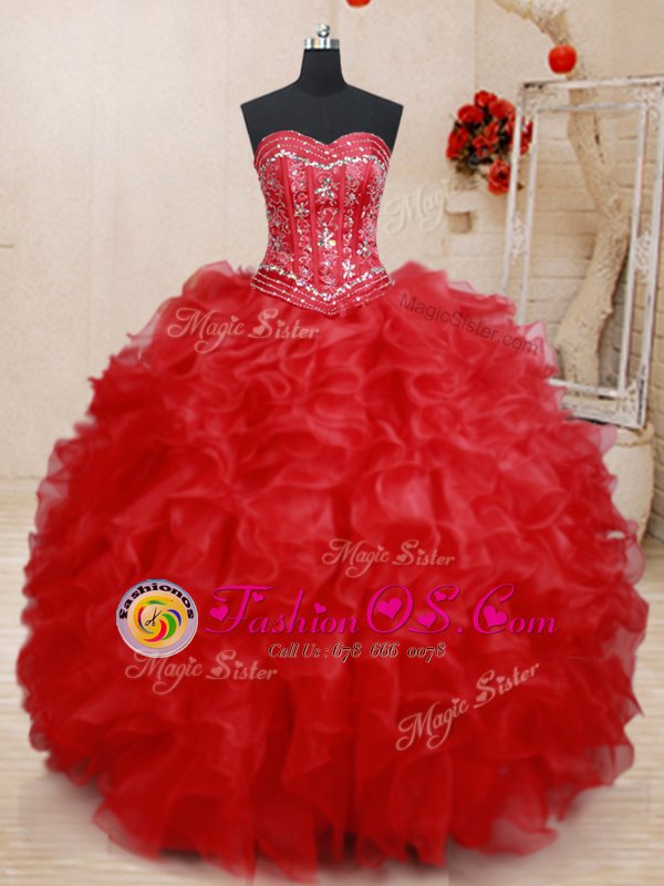 Four Piece Floor Length Red Quinceanera Gown Sweetheart Sleeveless Lace Up