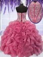 Four Piece Pink Ball Gowns Ruffled Layers and Sequins Quinceanera Dress Lace Up Organza Sleeveless Floor Length