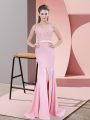 Free and Easy Baby Pink Prom Gown Prom and Party and Military Ball with Lace and Appliques V-neck Sleeveless Sweep Train Zipper