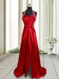 Free and Easy Halter Top Wine Red Sleeveless Elastic Woven Satin Brush Train Criss Cross Prom Dresses for Prom