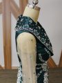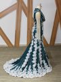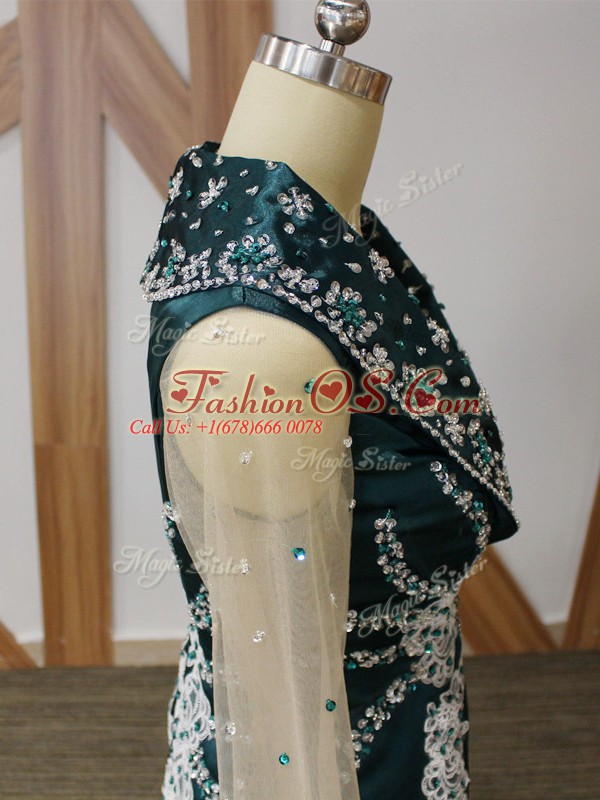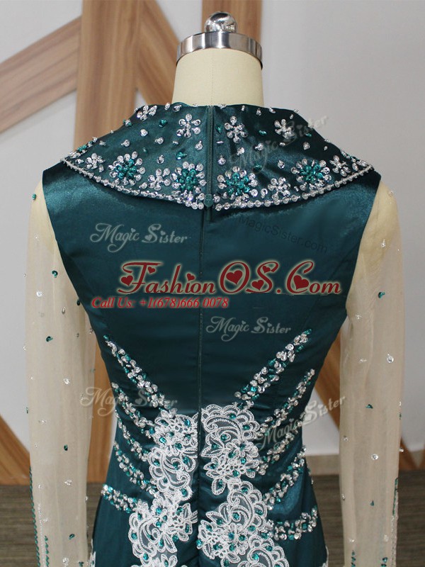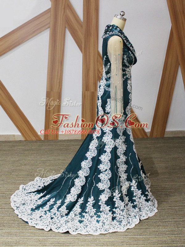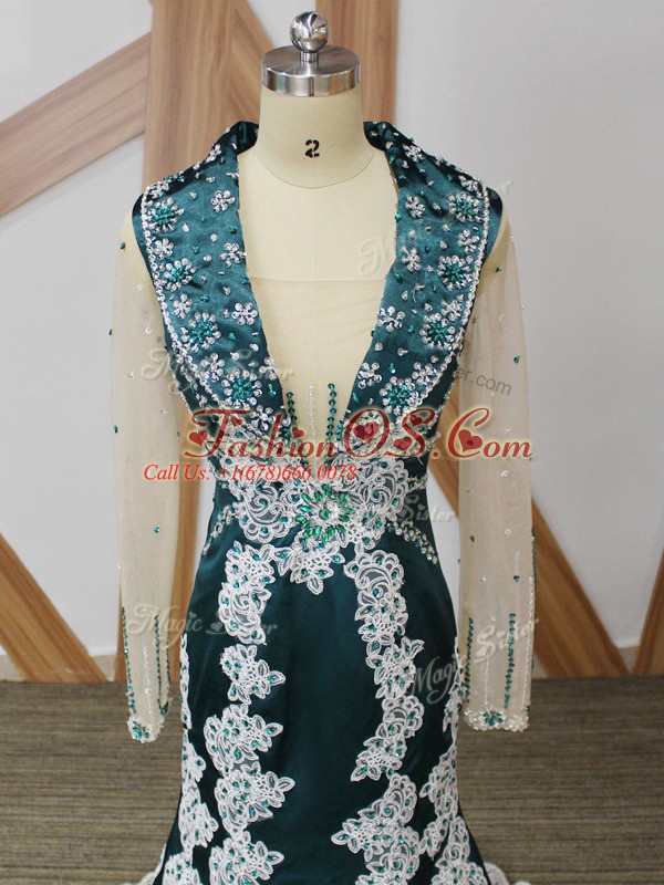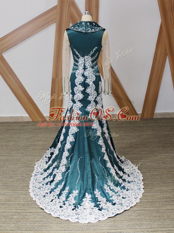 Free and Easy Long Sleeves Beading and Lace and Appliques Zipper Mother Of The Bride Dress with Navy Blue Brush Train