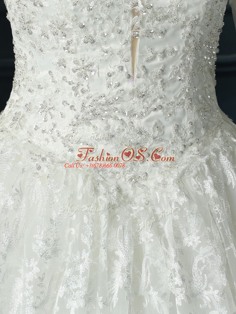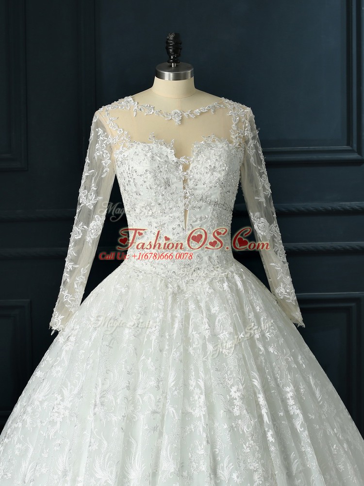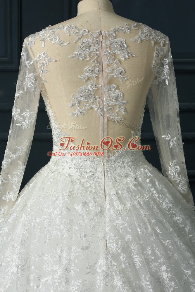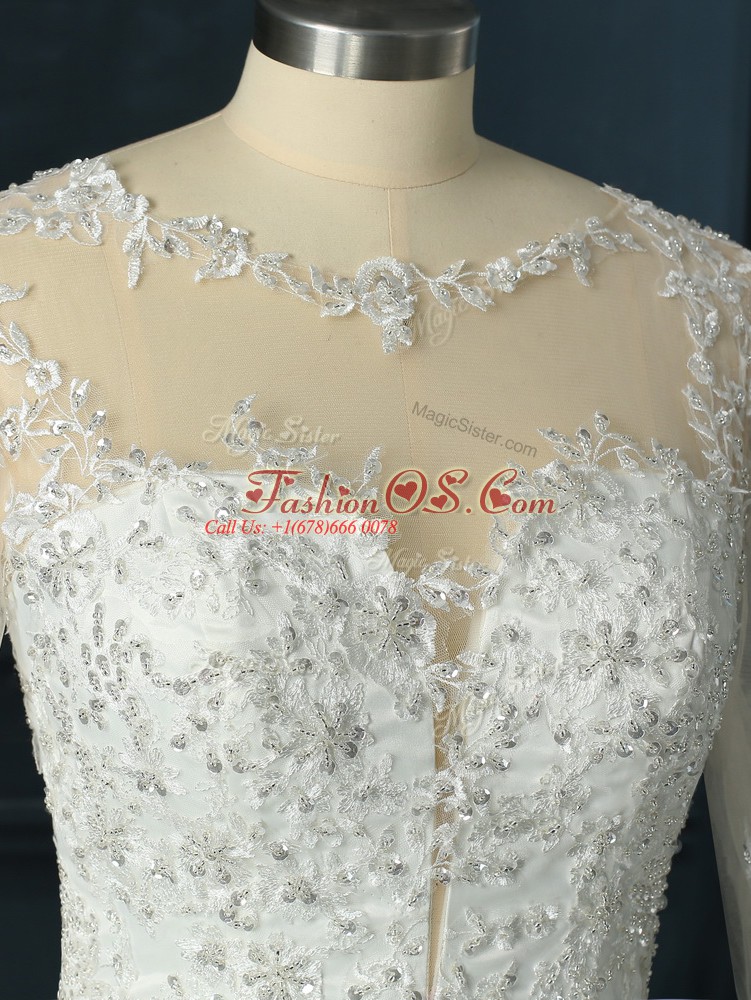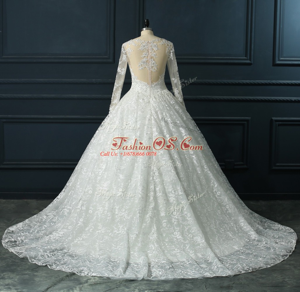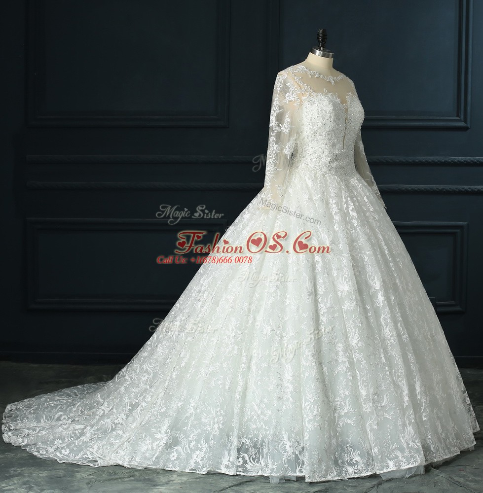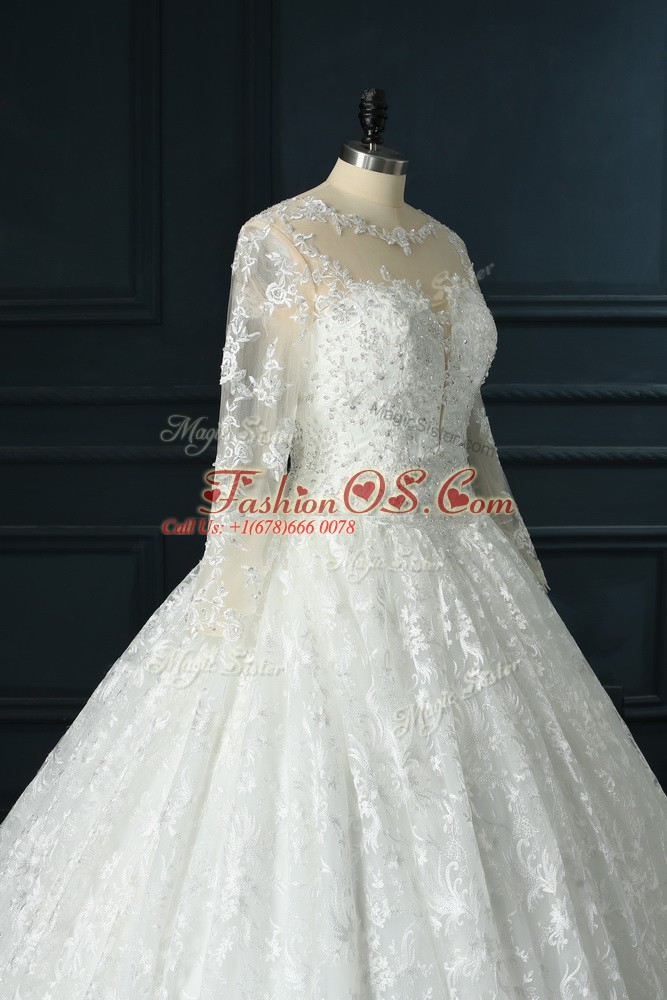 Free and Easy White Wedding Gown Lace Brush Train Long Sleeves Beading and Lace