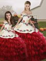 Home >  Quinceanera Dresses >  Princesita with Quinceanera Dresses > Free and Easy Wine Red Ball Gowns Off The Shoulder Sleeveless Organza Floor Length Lace Up Embroidery and Ruffled Layers Quinceanera Gown