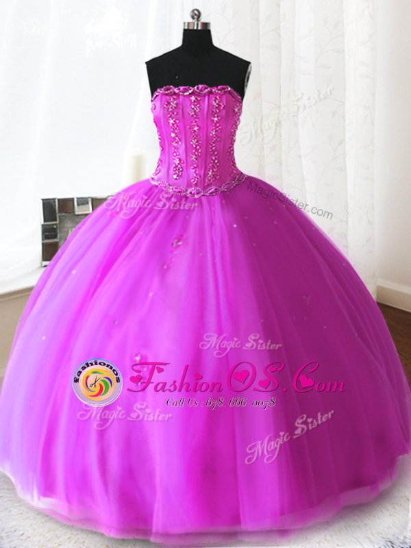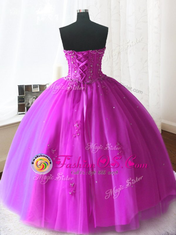 Fuchsia Ball Gowns Beading and Appliques Quince Ball Gowns Lace Up Tulle Sleeveless Floor Length