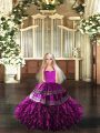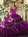 Fuchsia Ball Gowns Organza Halter Top Sleeveless Embroidery and Ruffles Floor Length Lace Up Sweet 16 Quinceanera Dress