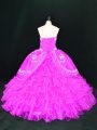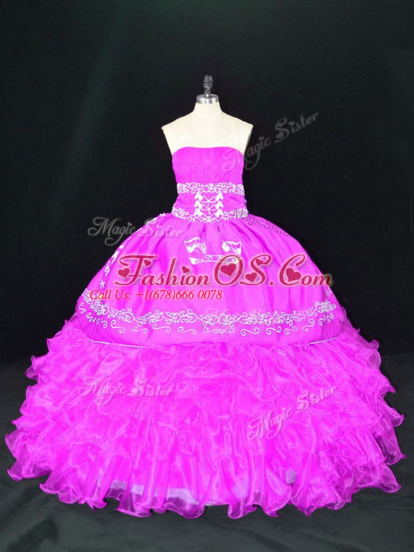 Fuchsia Ball Gowns Organza Strapless Sleeveless Embroidery and Ruffles Floor Length Lace Up Quinceanera Dresses