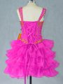 Fuchsia Ball Gowns Organza Straps Sleeveless Beading and Ruffled Layers Mini Length Lace Up