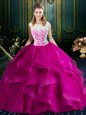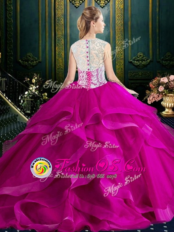 Fuchsia Ball Gowns Tulle Square Sleeveless Lace With Train Clasp Handle Quinceanera Dress Brush Train