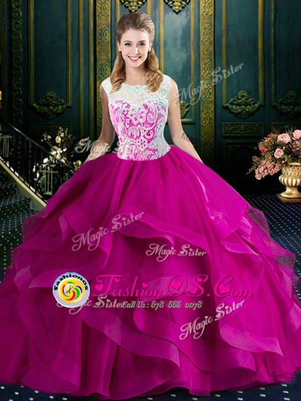 Home >  Quinceanera Dresses >  Cheap Quinceanera Dresses > Fuchsia Ball Gowns Tulle Square Sleeveless Lace With Train Clasp Handle Quinceanera Dress Brush Train