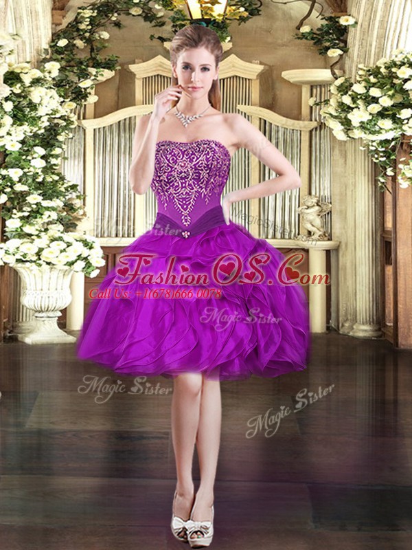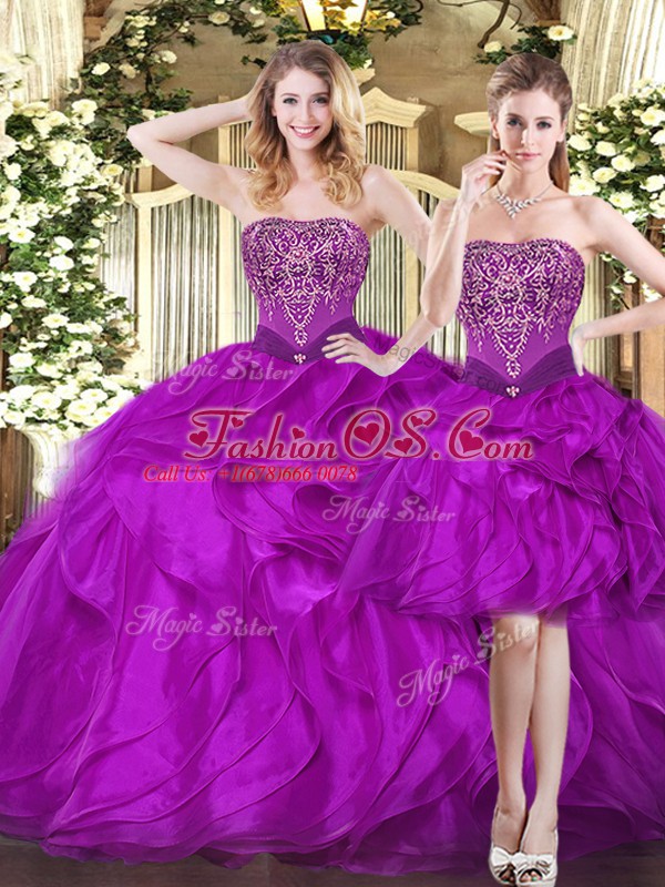Fuchsia Ball Gowns Tulle Strapless Sleeveless Beading and Ruffles Floor Length Lace Up Quinceanera Dress