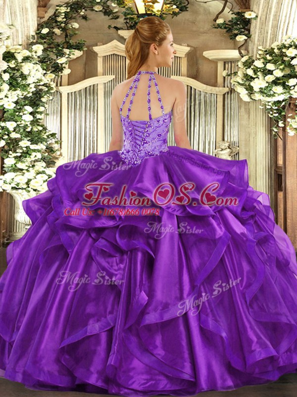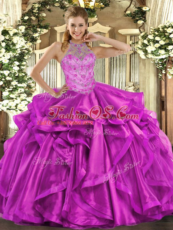 Fuchsia Halter Top Neckline Beading and Embroidery and Ruffles Quinceanera Dresses Sleeveless Lace Up
