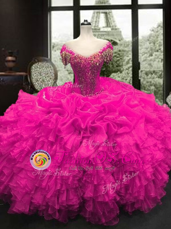 Fuchsia Lace Up Sweetheart Beading and Ruffles Vestidos de Quinceanera Organza Cap Sleeves