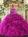 Fuchsia Organza Lace Up Strapless Sleeveless Floor Length Quinceanera Gown Ruffles and Pick Ups