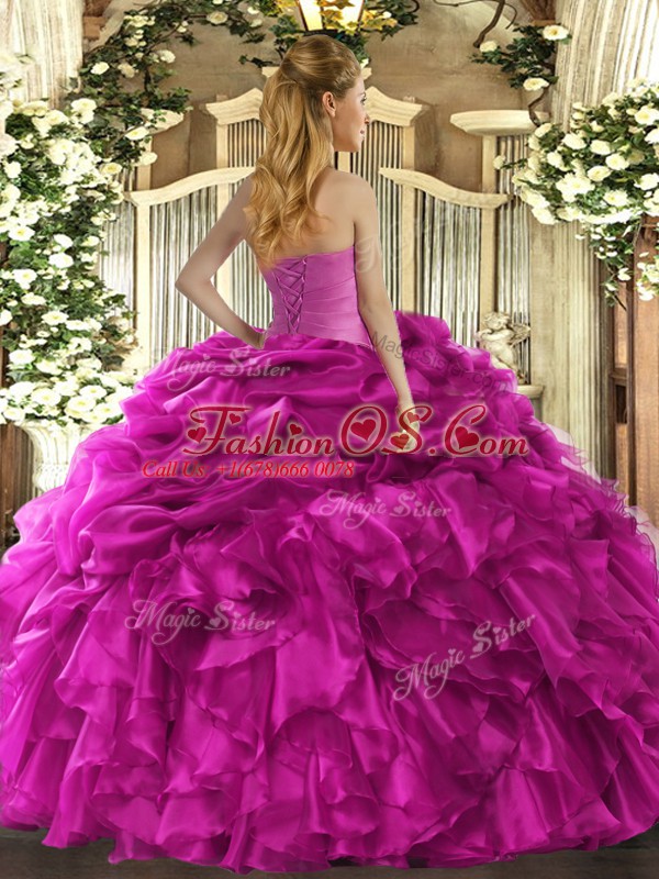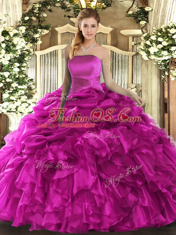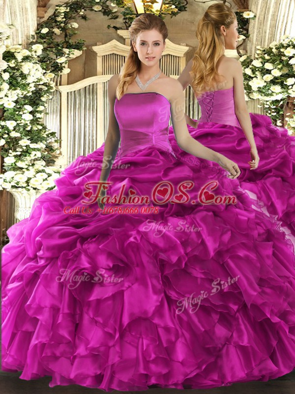 Home >  Quinceanera Dresses >  Quinceanera Dresses 2018 > Fuchsia Organza Lace Up Strapless Sleeveless Floor Length Quinceanera Gown Ruffles and Pick Ups