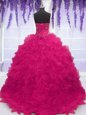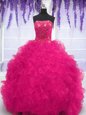 Fuchsia Organza Lace Up Strapless Sleeveless With Train Ball Gown Prom Dress Brush Train Beading and Ruffles