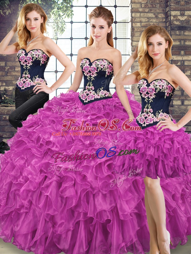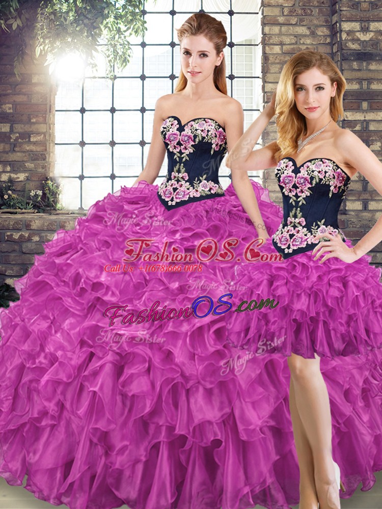 Home >  Quinceanera Dresses >  Removable Skirt Quinceanera Dresses > Fuchsia Organza Lace Up Sweet 16 Dresses Sleeveless Floor Length Embroidery and Ruffles