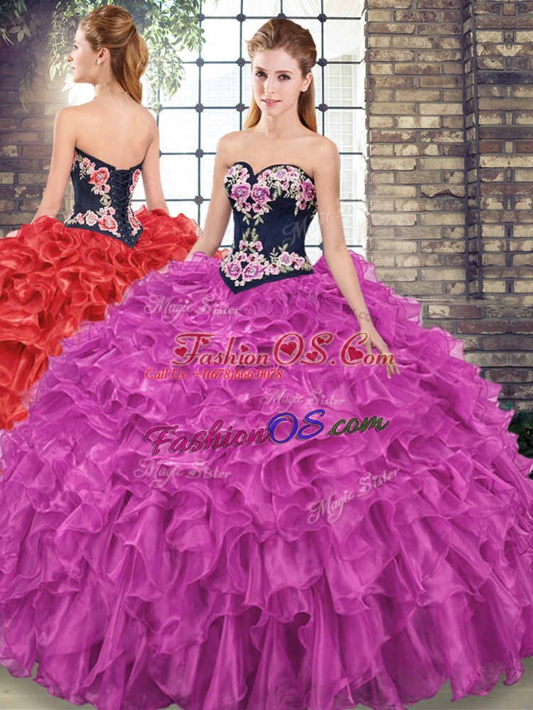 Fuchsia Organza Lace Up Sweet 16 Dresses Sleeveless Floor Length Embroidery and Ruffles