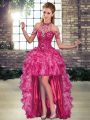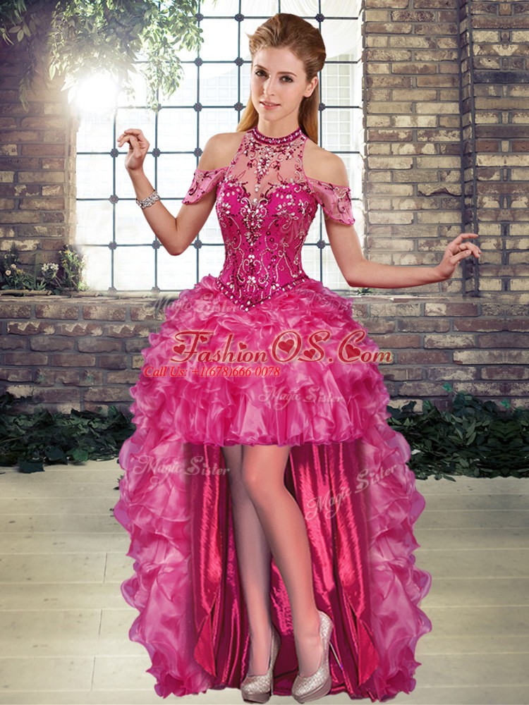 Fuchsia Quince Ball Gowns Military Ball and Sweet 16 and Quinceanera with Beading and Ruffles Halter Top Sleeveless Lace Up