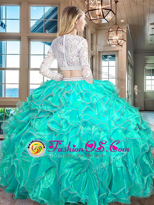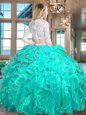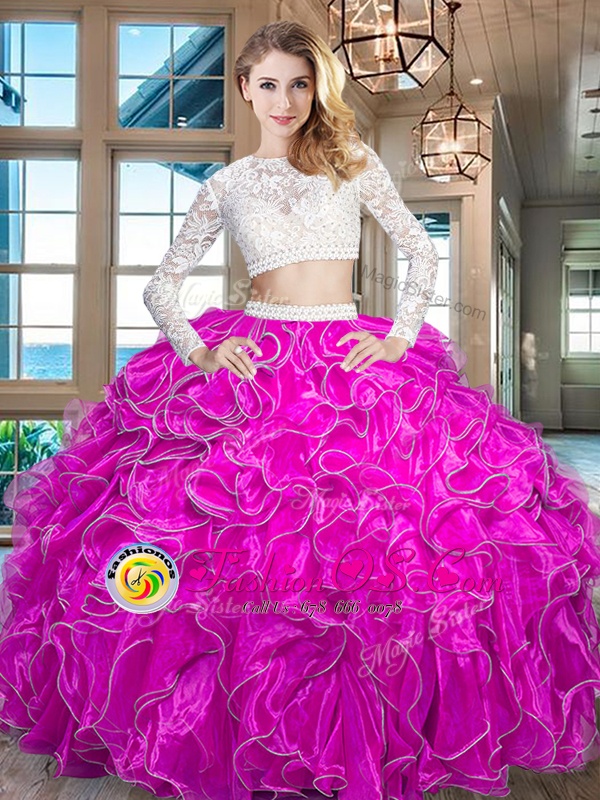 Fuchsia Scoop Neckline Beading and Lace and Ruffles Quinceanera Dress Long Sleeves Zipper