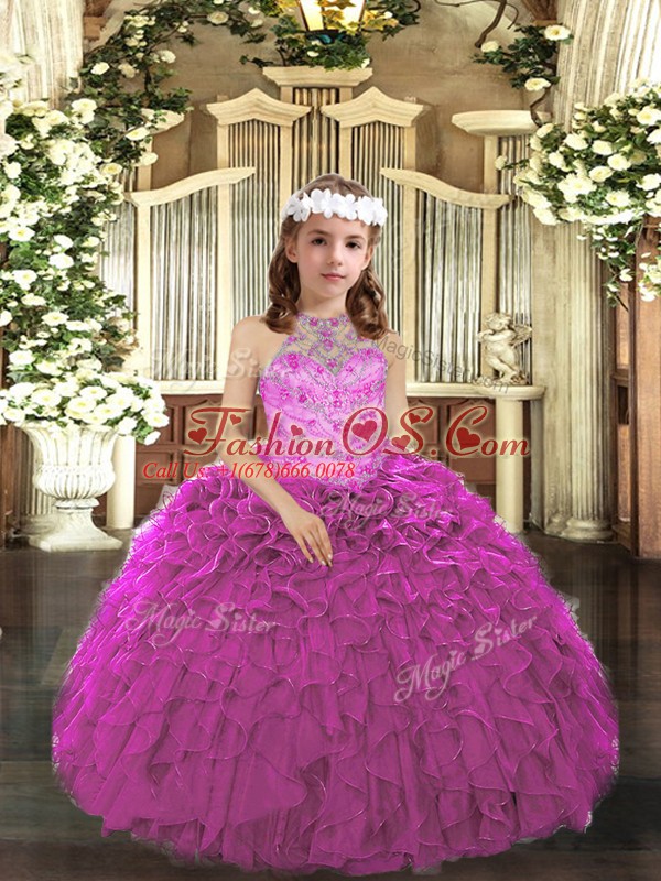 Fuchsia Tulle Lace Up Halter Top Sleeveless Floor Length Girls Pageant Dresses Beading and Ruffles