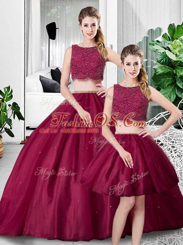 Fuchsia Two Pieces Lace and Ruching Vestidos de Quinceanera Zipper Tulle Sleeveless Floor Length