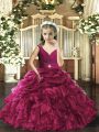 Fuchsia V-neck Neckline Beading and Ruffles and Pick Ups Kids Formal Wear Sleeveless Backless