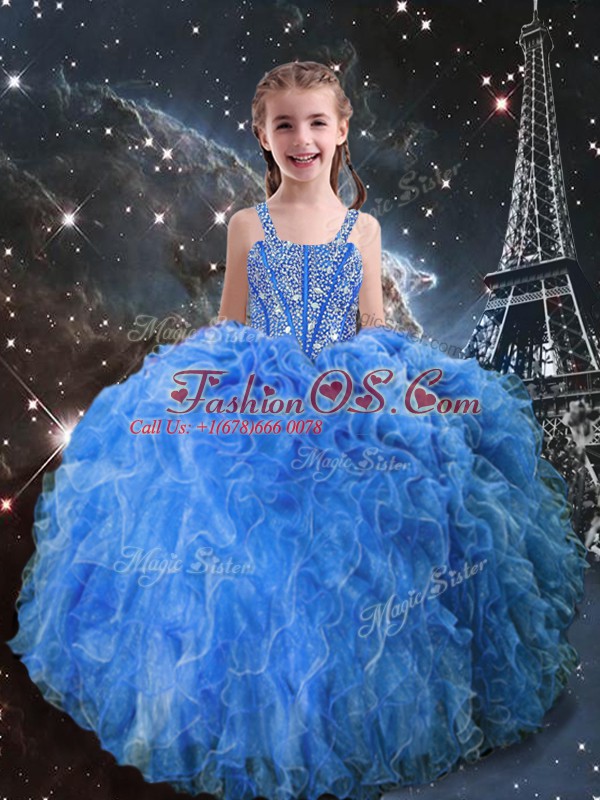 Glamorous Baby Blue Straps Neckline Beading and Ruffles Pageant Gowns For Girls Sleeveless Lace Up